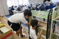 貸出カウンターでは、図書委員会児童が次々と並ぶ児童の学期末返却を、手際よく