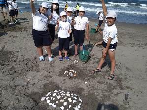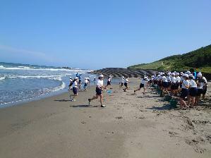 『砂浜活動』では『潮汲みリレー』に挑戦です。みんな