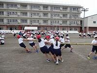 運動会での5・6年生の団体種目は、竹の棒を引き合う競技です。3つの色の組から2組ずつ総当たりで対戦していきます。1回戦は、お互いに決まっている竹を引き合います。竹の中心が自分の陣地の境界線を越えれば勝ちとなります。