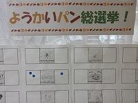 図書室廊下の妖怪パン投票用紙了解にシールを貼ります。「どの『ようかいパンキラキラ』にしようかな~笑う。」みなさんじっくりと見て虫眼鏡、選んでいます。