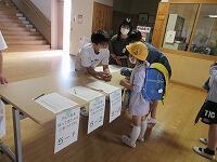 大きな箱に備え付けたビニール袋にアルミ缶を入れたら、学年表示のある名簿にチェック