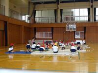 1年生の体育は、とにかく楽しく運動できることを大切にしています。体育館では1組がマットを使って、いろいろな動きを練習していました。腕の支持力やバランス感覚を育てる運動に挑戦しました。