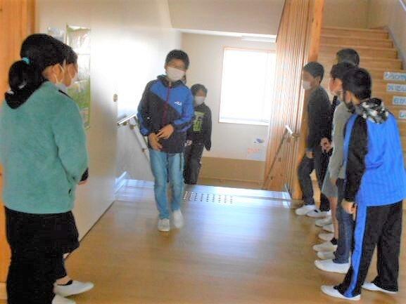 各界の階段ののぼり口で友達を出迎え、元気に「おはようございます」と声掛けしています。