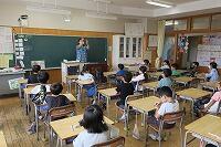 校庭に児童が整列したところで、全校生にボランティアのみなさんを紹介し、元気よくあいさつをしました。「よろしくお願いします。」