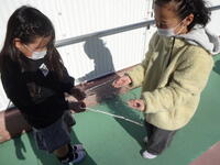 2年生が、磁石やおもり、風の力などで動くおもちゃを作りました。今日は、1年生を招待しておもちゃで遊んでもらう時間をつくりました。