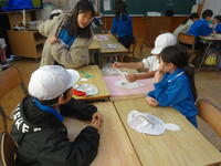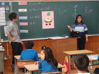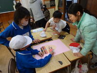 4年生の外国語活動で、クリスマスにちなんだ福笑いをしました。目隠しした友だちに、うまくパーツが置けるように「Up」「Down」「Right」「Left」と英語で声をかけました。