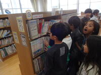 今日も1・2年生がクラスごとに図書室にやってきました。図書室の入口にあるクリスマスの飾りを見て興味をもっていました。せっかくの特別貸し出しとあって、友だちと一緒に本を探したり、薦め合ったりしていました。