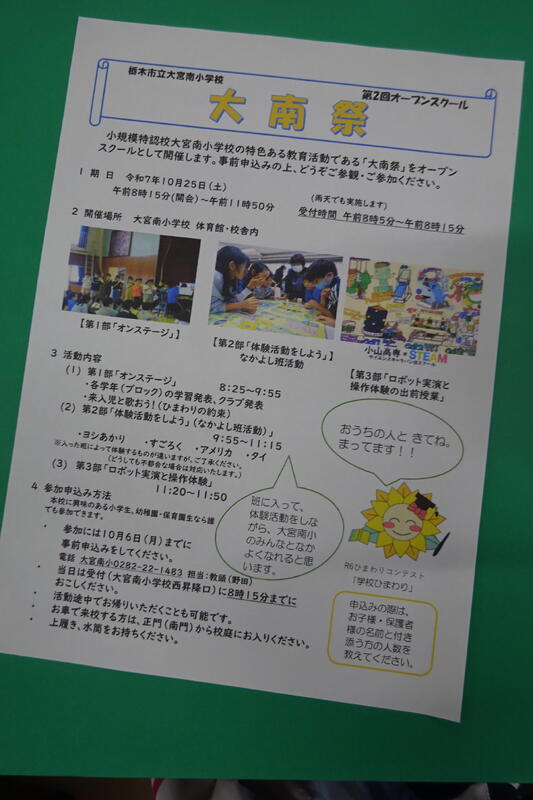 一覧へ 第2回オープンスクール『大南祭』のお知らせ 投稿日時: 09/20 大宮南小管理者 大宮南小学校の特色ある教育活動の1つ、『大南祭』をオープンスクールとして公開します。 本校に興味のあるお子さんと保護者の皆様、どうぞご参観・ご参加ください。 興味のある方は、上のチラシのPDFファイルを添付してありますので、詳しくご覧いただければと思います。 R7チラシ(大南祭).pdf