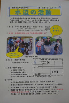 一覧へ 第1回オープンスクール「水辺の活動」のお知らせ 投稿日時: 06/01 大宮南小管理者 大宮南小学校の特色ある教育活動の1つ、赤渕川用水池・水田での「水辺の活動」をオープンスクールとして公開します。 本校に興味のあるお子さんと保護者の皆様、どうぞご参観・ご参加ください。 興味のある方は、上のチラシのPDFファイルを添付してありますので、詳しくご覧いただければと思います。 チラシ(水辺の活動).pdf