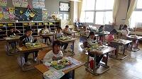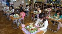 ▲担任の先生は、アクリル板ごしに児童と向かい合って、食べている様子を見ながら食事をしています。