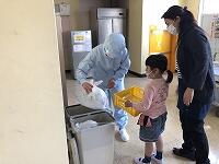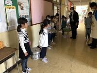 今日は、手洗い・うがいをしっかりして、身支度や準備を整えて、一人一人が並んで配膳することを指導しました。少しずつ慣れてきたら、給食当番としてのいろいろな仕事も教えていきますよ!!