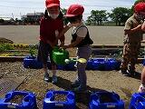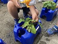 昨日は、雨が降ったのに、「土が乾いているよ。」「風で植木鉢が倒れないように、壁の方に寄せたからかな?」「葉っぱがしょんぼりしてるよ。」などと話したり予想したりしながら、水やりをしています。