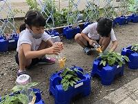 登校するとすぐに、自分の育てている野菜や花の様子を観察する子どもたち・・・「教室に行って荷物を下ろして、用意や着替えが終わってから」という約束になっているので、1年生が、一人二人と、昇降口から出てきました。