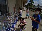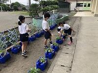 1年生は、毎朝登校して、荷物の整理をすると、アサガオの観察と世話をしています。今朝も元気に外に出てきました。