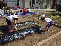 子どもたちは、ミニトマト、オクラ、えだまめ、ナス・・・などいろいろな野菜を持ってきて植えました。みんな、「おいしい野菜ができるといいな」と楽しみにしています。