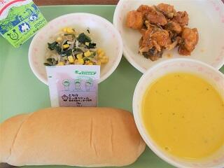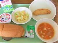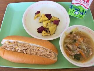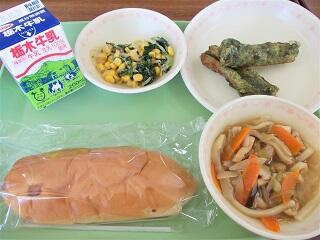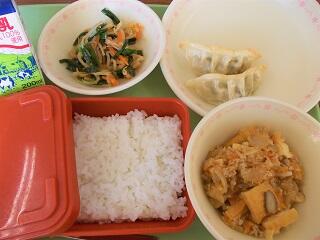 〈メニュー〉はちみつパン、やきそば、揚げ餃子、もやしとヤングコーンのサラダ、牛乳