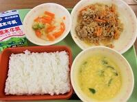 ごはん・ニラそぼろ丼の具・厚焼き卵・根菜の味噌汁・牛乳