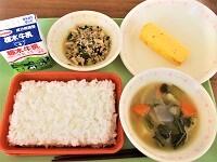 ごはん・ニラそぼろ丼の具・厚焼き卵・根菜の味噌汁・牛乳