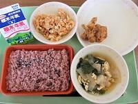お赤飯をいただきながら、学校全体で「6年生、卒業おめでとう」の気持ちになりました喜ぶ・デレ