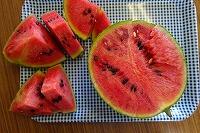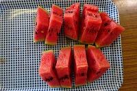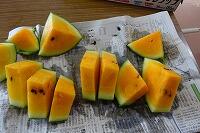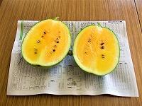 なんと、スイカもちょうどよい大きさになっていました。割れてしまったものもありましたが、きれいに育っていたものを収穫して切ってみました。すると・・・