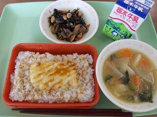 ごはん・ニラそぼろ丼の具・厚焼き卵・根菜の味噌汁・牛乳