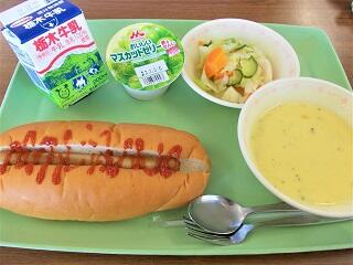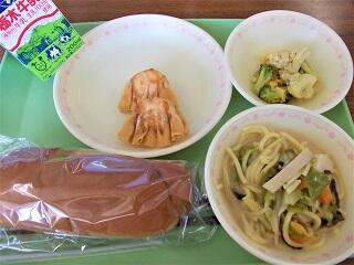 〈メニュー〉はちみつパン、やきそば、揚げ餃子、もやしとヤングコーンのサラダ、牛乳