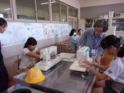 先生の話を聞いたり、動画を見たりしながら、ボランティアの皆様にやり方をやさしく教えていただき、正しくミシンをつかって縫うことができました
