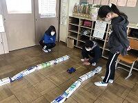 走らせたゴムの車が決められた場所にぴったり止まるように、ゴムの伸ばし具合を調節します。