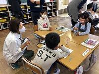 ▼なかよし班ごとに、どんな絵を描くか話し合います。