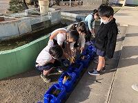 6年生が、昇降口で理科の学習をしていました。時々雲に覆われてしまう太陽の光絵文字:晴れ後くもりを、鏡で調節して集め、ソーラー電池に当てて、プロペラや車を走らせる実験をしていました。