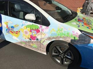 ▼児童たちが降りた後のバスは、手すりやシートベルトなど、時間をかけてしっかり消毒しました。
