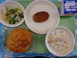 バーガーパン ハンバーグケチャップソースかけ やさいサラダ だいずのシチュー ぎゅうにゅう