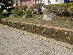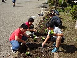 休み時間には、緑化担当と5年生ボランティアが、花壇にパンジーとビオラの苗を植えていました。