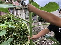 アサガオの観察に来た1年生まで、集まってきて、ひまわりの花をのぞき込んでいました。