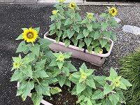 玄関のひまわりの花が咲きました。今日は曇り空ですが、どのひまわりもみんな、一斉に、お日様の方を向いていて、とてもかわいいなぁと思いました。