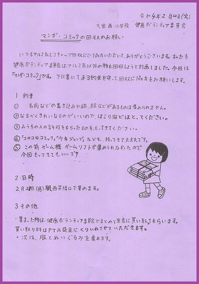その代わりとして、2月14日(月)~15日(火)9時~16時の間、大宮南小にて、リサイクル品の回収を行っています。集めていただいた資源物を学校にお届けいただければ幸いに存じます。