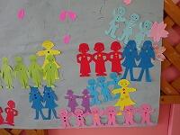 切り紙の子どもたちが、手をつないだり、楽しく遊んだり。大きい子も小さい子も、みんなでお祝いしているようすが伝わります