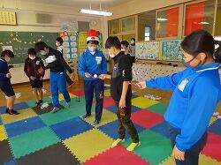 大宮南小の6年生が市有バスで大宮北小に移動して、3時間目に多目的室で、3・4組の友達とレクリエーションをしています。自己紹介をしながらのゲームで、いろいろな人と交流しています。最初は少し緊張している子もいましたが、だんだん時間がたつにつれて少しずつ慣れてきて、もうすっかり、みんないい笑顔です!!