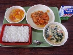 今日の給食のメニューは、ご飯、牛乳、ケチャップライスの具、たまごスープ、アセロラジュレポンチ
