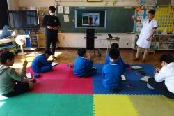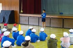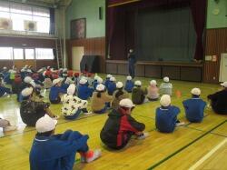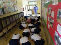 まず、竜巻の避難訓練の様子をご覧いただきました。子どもたちは、素早く自分の身を守る待避行動を取ることができていました。委員の皆様にもお褒めの言葉をいただきました。