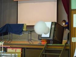 新聞紙の上に親子で乗り、先生とジャンケンして負けたら、新聞紙を半分にします。
