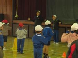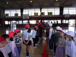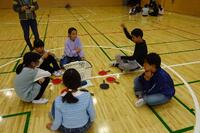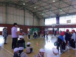 体育館で、親子新聞ジャンケン、親子ドッジビーを実施しました