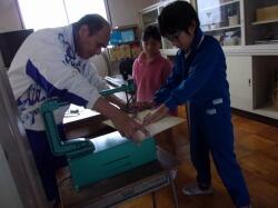 糸鋸を使う時の注意点等を聞いた後、電動糸鋸を正しく使用し、まずは、使い方に慣れるよう直線から切りましたみんな、指示通り、慎重に電動糸鋸を使用し、友達と助け合いながら頑張っていました