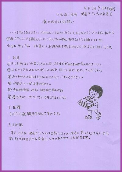 朝の昇降口で健康ボランティア委員会に渡してください。