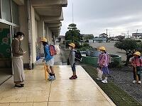 子どもたちは、先週から長袖を着て元気に登校しています。緊急事態宣言期間中は、昇降口前で体調チェックをしています。教頭先生や図書事務の先生に「体温・家族の状況」を報告してから校舎内に入ります。