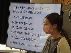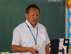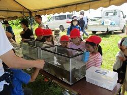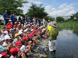講師の先生から「生き物調査」の目的や魚の捕り方等の説明がありました。