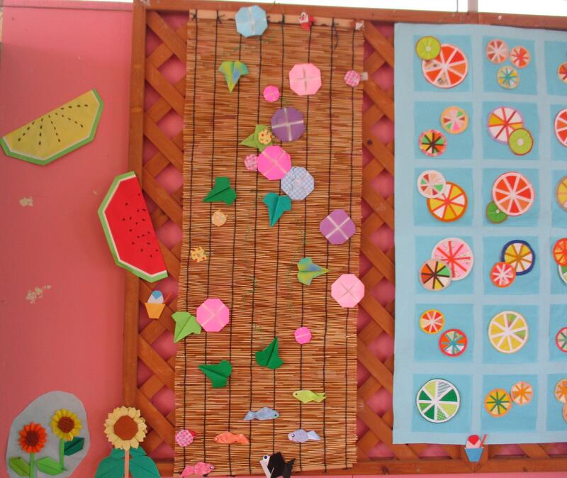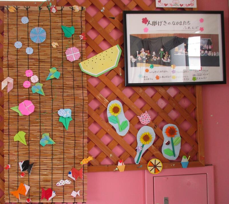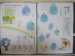 『梅雨を楽しもう』の掲示です。見方を変えて、蒸し暑い日を乗り切りたいですね。