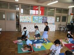 1、2年生が体育の時間にマット運動に取り組んでいます。