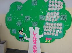 【委員会活動】「親切の木」です。優しい行いをしてくれた人に感謝の気持ちを表して、「親切の木」に貼っていますどんな優しい姿が書かれているのでしょう。今年も、親切の花がたくさん咲き始めましたよ