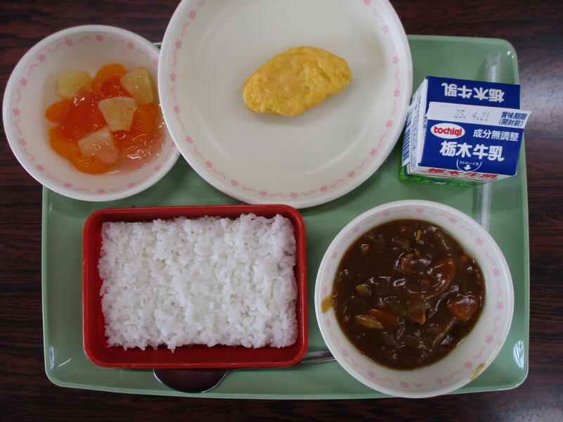 ごはん ポークカレー オムレツ アセロラジュレポンチ 牛乳